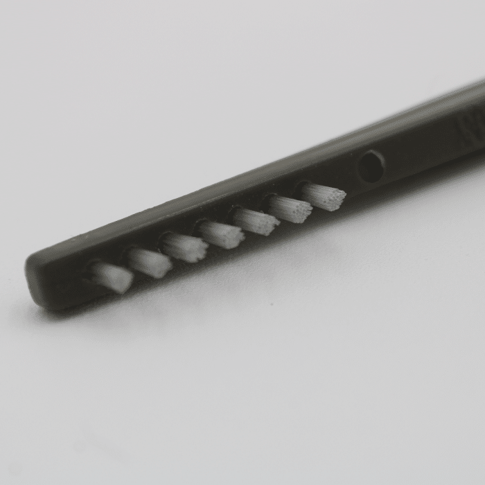 Dual-Purpose Toothbrush-Style with white nylon bristles staple-set at each end of the plastic handle. Dual brush heads allow for cleaning in the smallest areas. Great for fine detail work.