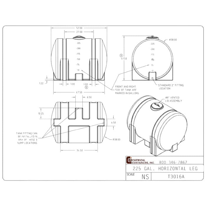 225 Gallon Horizontal Leg Tank – 52″ L x 38″ D x 41″ H